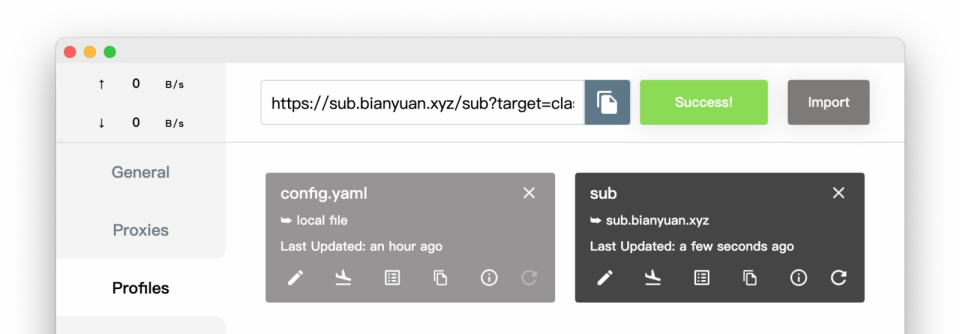 2.打开 Clash for Windows for Mac 后,点击窗口左侧的 Profiles (配置文件)。