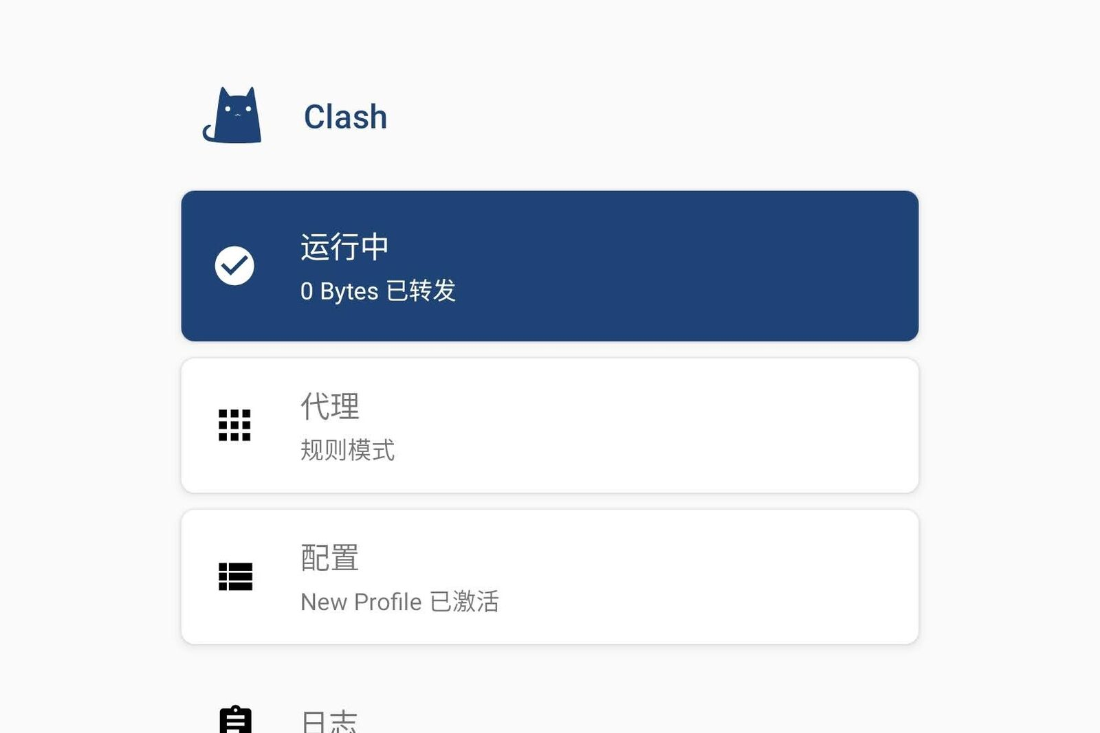 添加配置后,返回主界面,点击顶部「已停止」按钮,即可启用 Clash 系统代理。
