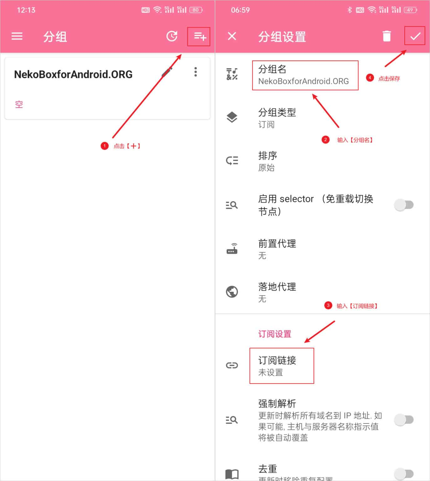 在弹出的分组主界面,点击右上角的 ➕ 号按钮即可出现分组设置界面,在分组名输入自己能区分这个分组的内容,分组类型选择订阅,然后在分组设置的订阅链接复制节点订阅地址,点击右上角的 ✔ 按钮保存即可,如下图所示: