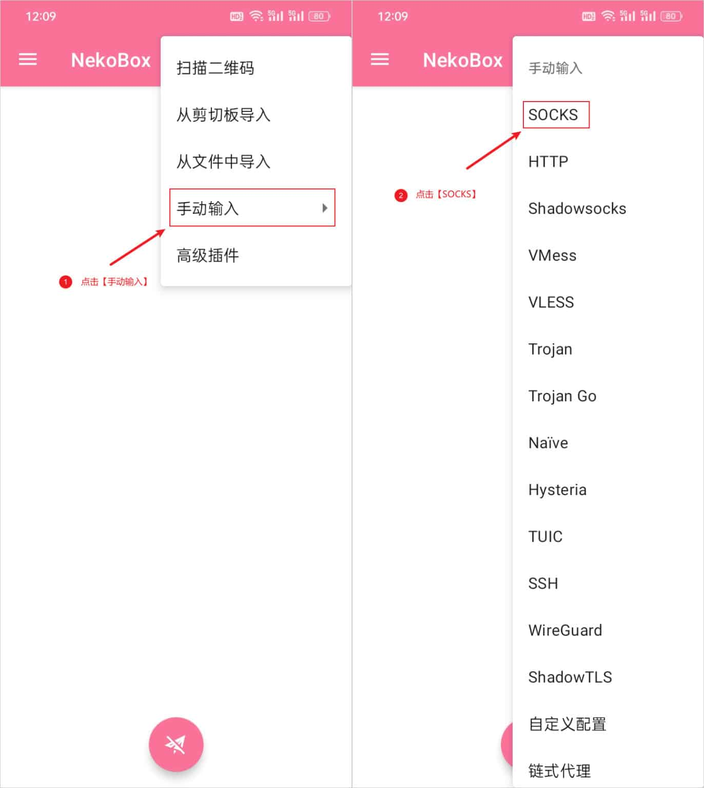 配置 Socks 服务器节点,通过点击软件主界面右上角的 ➕ 号按钮即可出现添加配置文件选项,选择手动输入,随后在弹出的窗口中选择 Socks 选项,如下图所示: