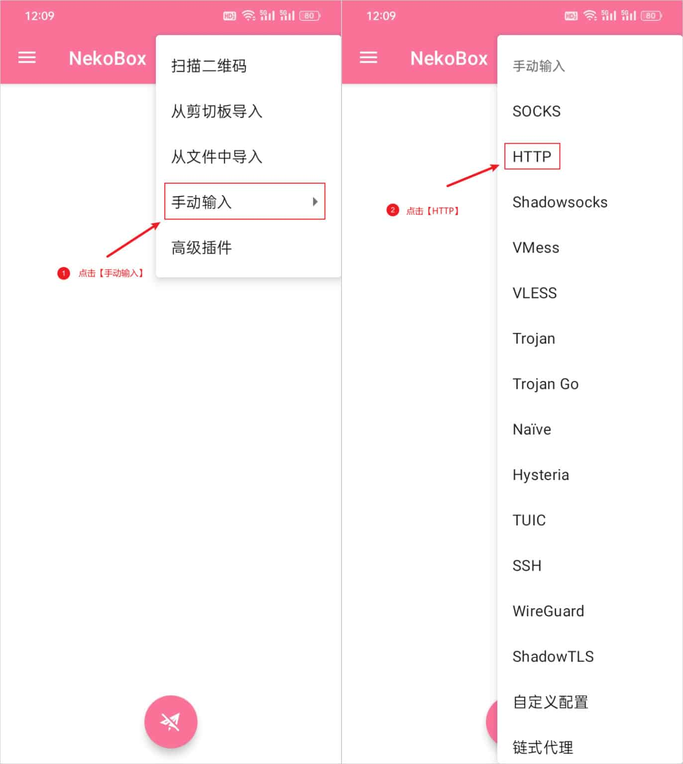 配置 HTTP 服务器节点,通过点击软件主界面右上角的 ➕ 号按钮即可出现添加配置文件选项,选择手动输入,随后在弹出的窗口中选择 HTTP 选项,如下图所示: